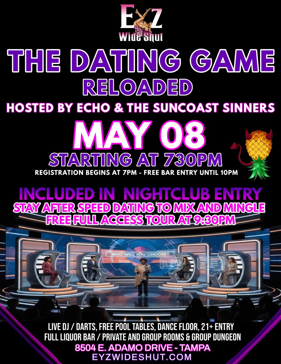 « All Events Click Here for More Info About The Dating Game Reloaded May 8 @ 7:30 pm « Click Here for More Info About Pineapple Party Click Here for More Info About Trenchcoats & Lingerie Ladies Night » Included In Nightclub Entry Stay After Speed Dating To Mix And Mingle Free Full Access Tour At 9:30pm! Add to calendar Google Calendar iCalendar Outlook 365 Outlook Live Details Date: May 8 Time: 7:30 pm Event Tags:attraction, Eyz Wide Shut, florida lifestyle clubs, florida swinger clubs, swing lifestyle, Tampa swinger clubs Website: https://eyzwideshut.com/events/ Venue EYZ Wide Shut 8504 Adamo Drive Tampa, FL 33619 United States + Google Map Phone 813-620-1234 Related Events Click Here for More Info About Bi-Curious Night April 2 @ 6:00 pm Click Here for More Info About Tropical Temptation April 3 @ 7:00 pm Click Here for More Info About Sultry Bunny Bash April 4 @ 7:00 pm