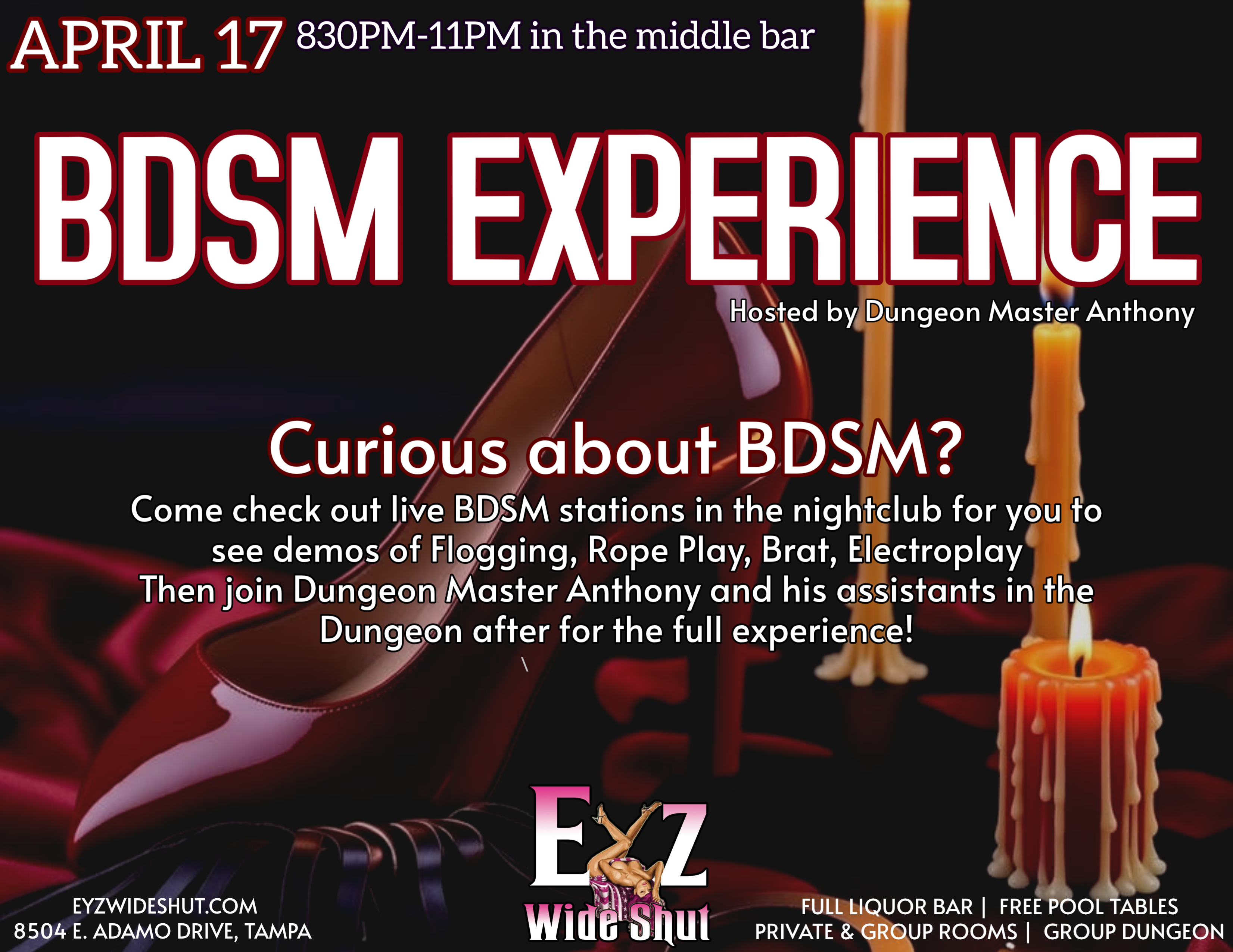 • BDSM Experience inside the middle bar with Sir Anthony from 830pm-11pm doing BDSM Demos!  Free with bar entry!